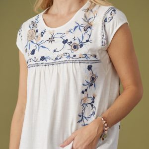 So airy and feminine. this scoop neck. cap sleeve. slub tee with allover floral and geometric embroidery and flattering empire shape. Easy fit. Cotton. Hand wash. Sizes XS (0-2). S (4-6). M (8-10). L (12-14). XL (16-18). Approx. 25.5l.