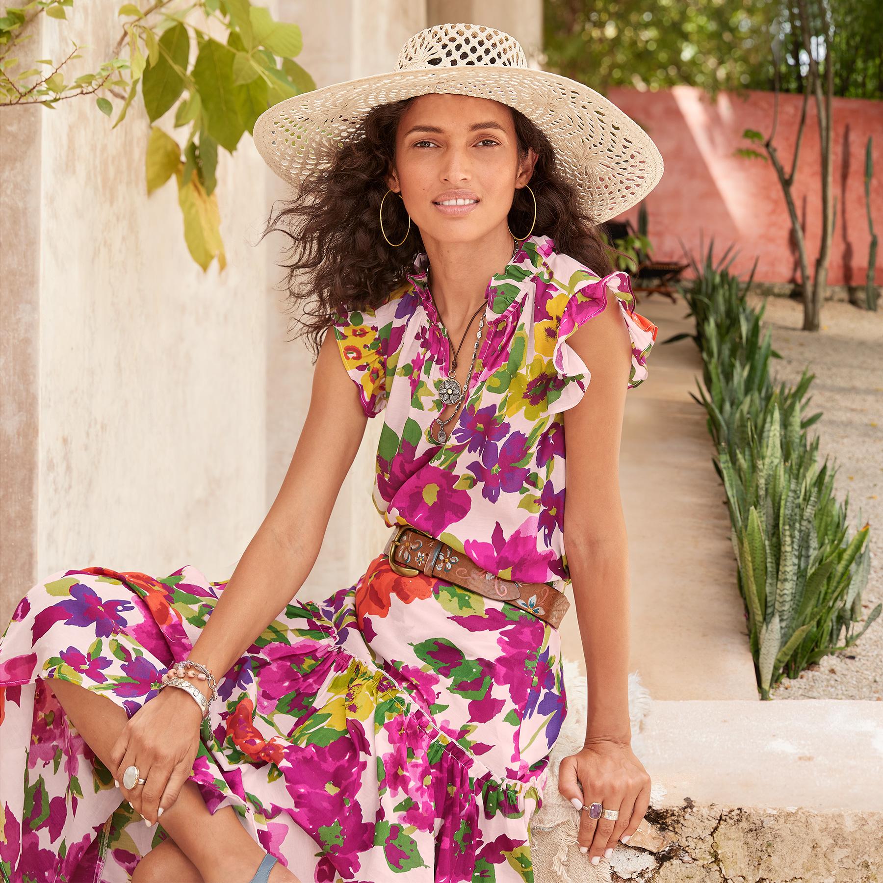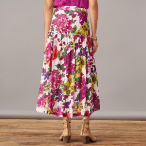 Our high waisted fit and flare skirt is so beautiful in a vibrant floral print with ruffle detail at the tier. Elastic at the back waist and side zipper for an easy. comfortable fit. Fully lined. Cotton/viscose. Machine wash. Imported. Exclusive. Sizes XXS (00). XS (0-2). S (4-6). M (8-10). L (12-14). XL (16-18). Approx. 33.5l.