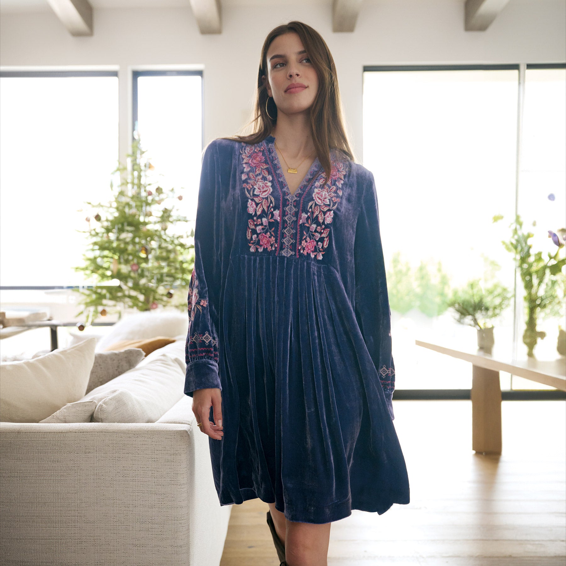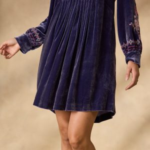 So luxurious. our velvet notch neckline popover dress is blooming with lovely embroidery on the front placket. two side seam pockets and pleating details. Viscose/silk. Dry clean. Imported. Exclusive. Sizes XS (0??). S (4??). M (8??0). L (12??4). XL (16??8). XXL (20??2). Approx. 37l.