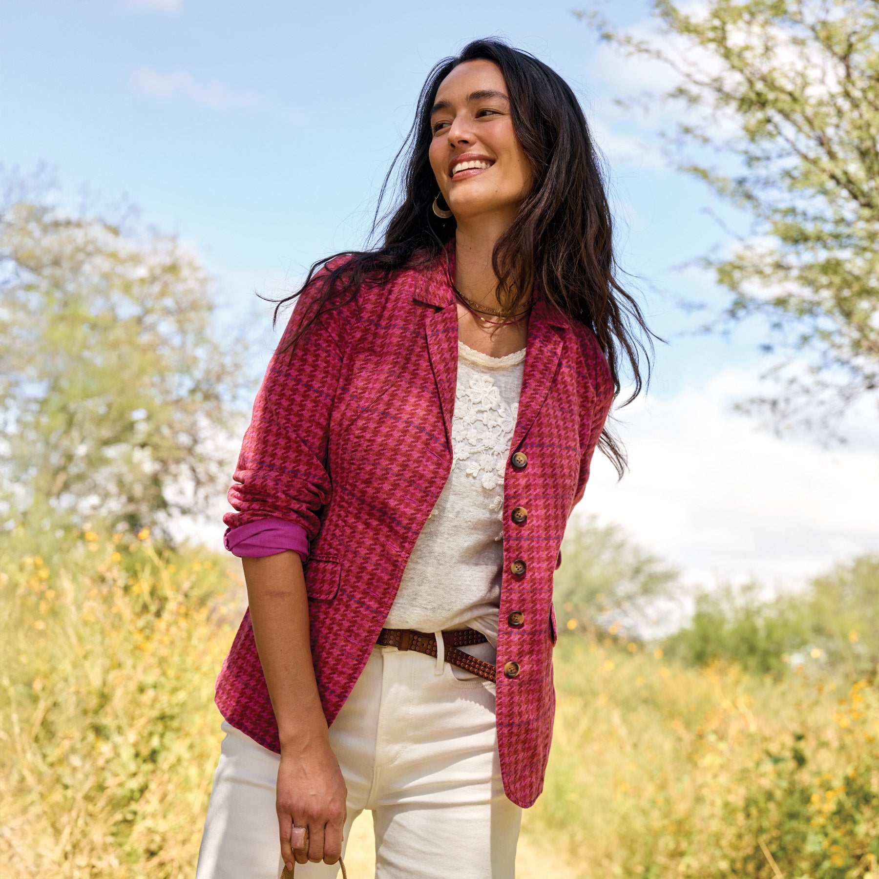 Here’s a match made in heaven: the sweet structure of an ultra-femme blazer. with the easygoing vibes of softest linen! Five-button placket with high-notch collar. flap pockets. back cinch belt and contrast floral lining. Cotton/linen. Machine wash. Imported. Exclusive. Sizes XS (0-2). S (4-6). M (8-10). L (12-14). XL (16-18). XXL (20-22). Approx. 25.5l.