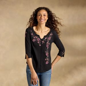 Lush floral embroidery blooms across our Cuyamaca top with raw-edge details. novelty notch neckline and flattering princess seams. Elbow length sleeves. Cotton. Machine wash. Imported. Exclusive. Sizes XS (0–2). S (4–6). M (8–10). L (12–14). XL (16–18). XXL (20–22). Approx. 24l.