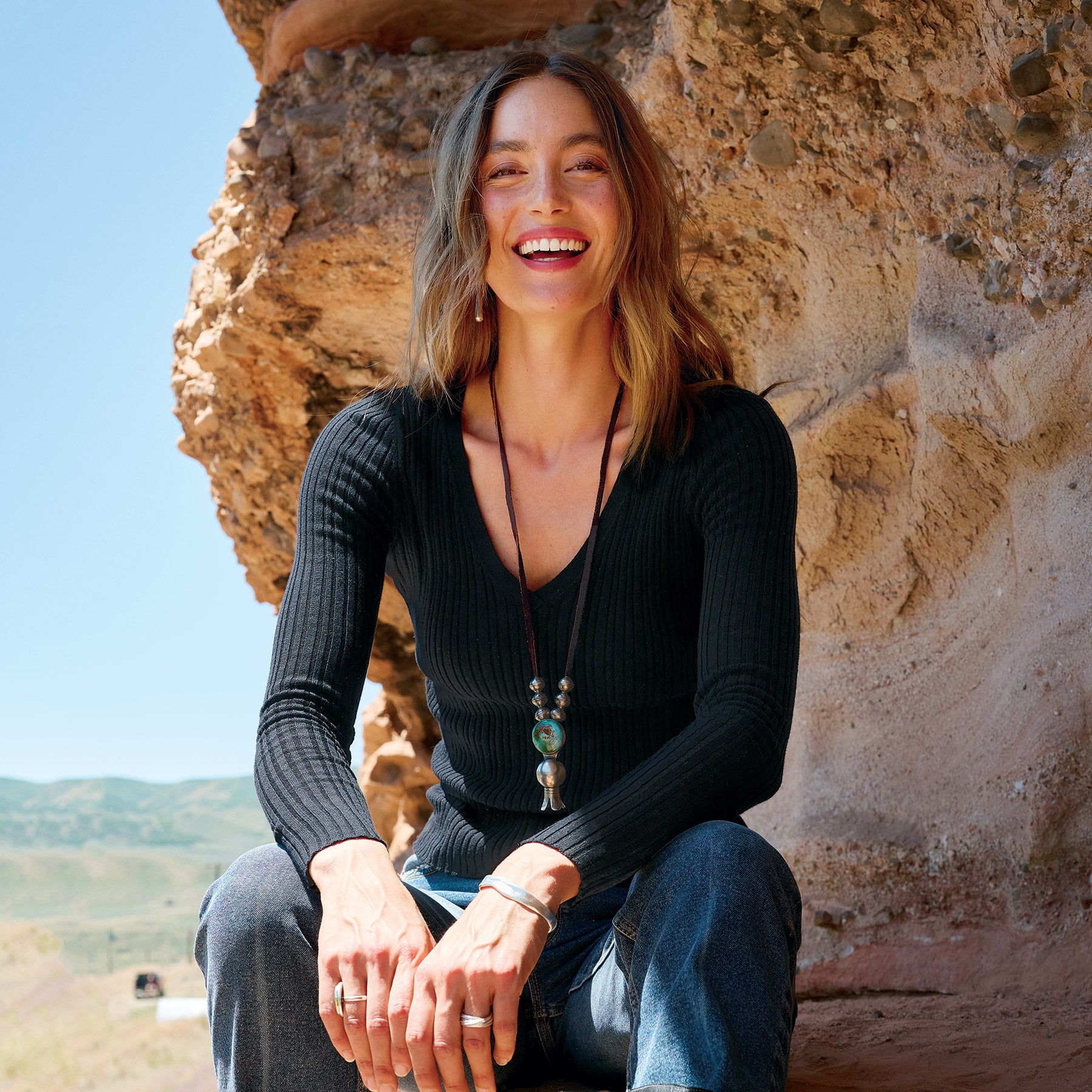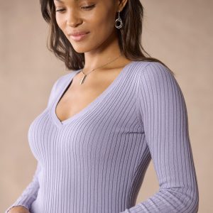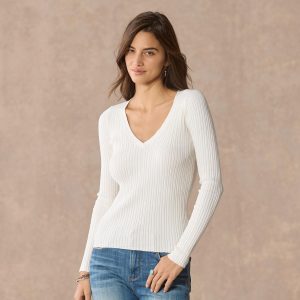 Simple and sophisticated. our fitted. mixed rib stitch sweater. in Lightest Legends yarn. V-neck. Cotton/nylon/spandex. Machine wash. Imported. Exclusive. Sizes XXS (00). XS (0–2). S (4–6). M (8–10). L (12–14). XL (16–18). Approx. 22l.