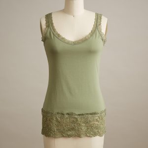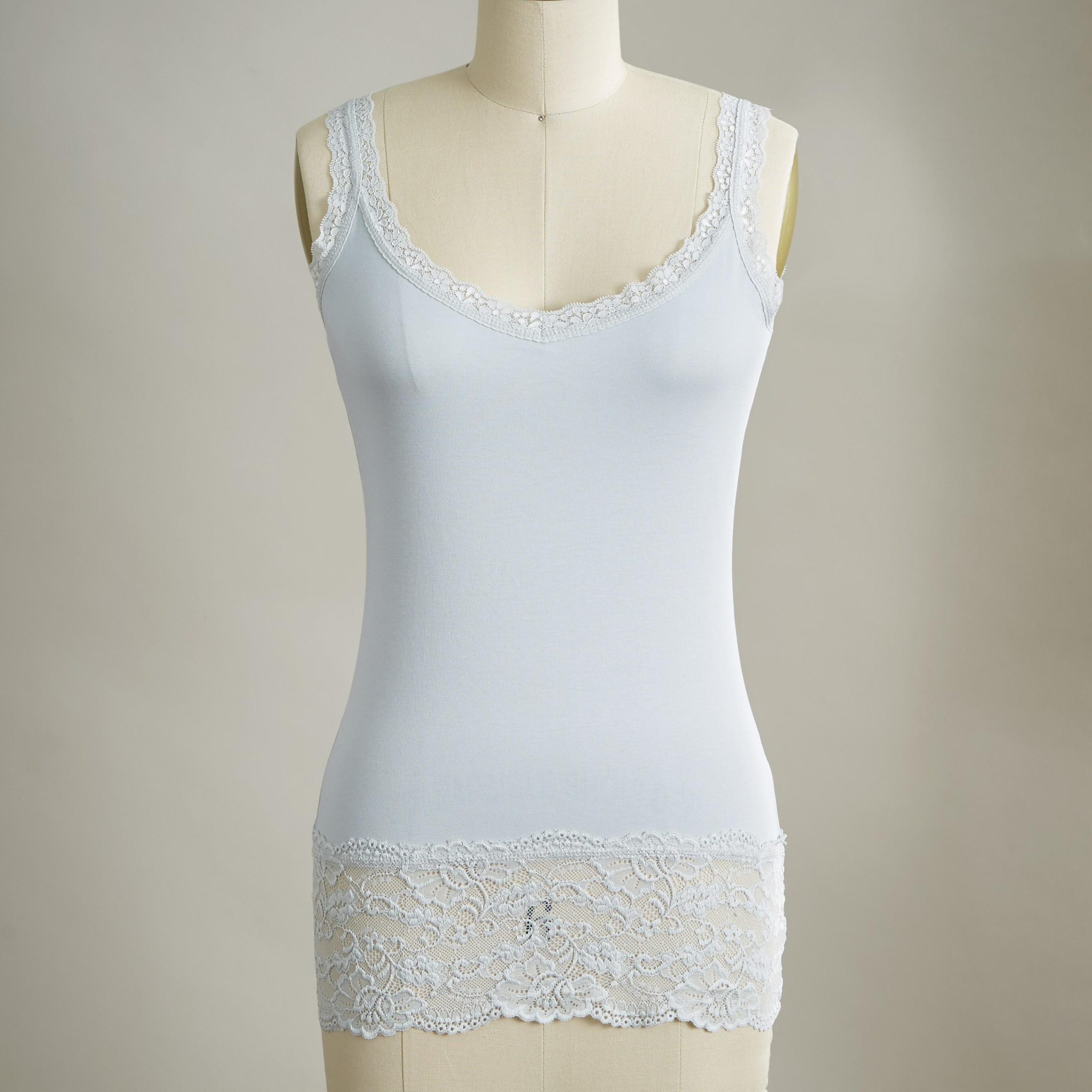 Our essential. lace-trimmed tank is slim-fitting for plenty of versatility. Pair with a sweater or tee for a glimpse of flirty lace. Cotton/spandex. Machine wash. Portugal. Exclusive. Sizes XXS (00). XS (0–2). S (4–6). M (8–10). L (12–14). XL (16–18). Approx. 23.5l.