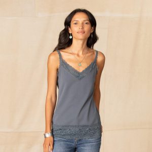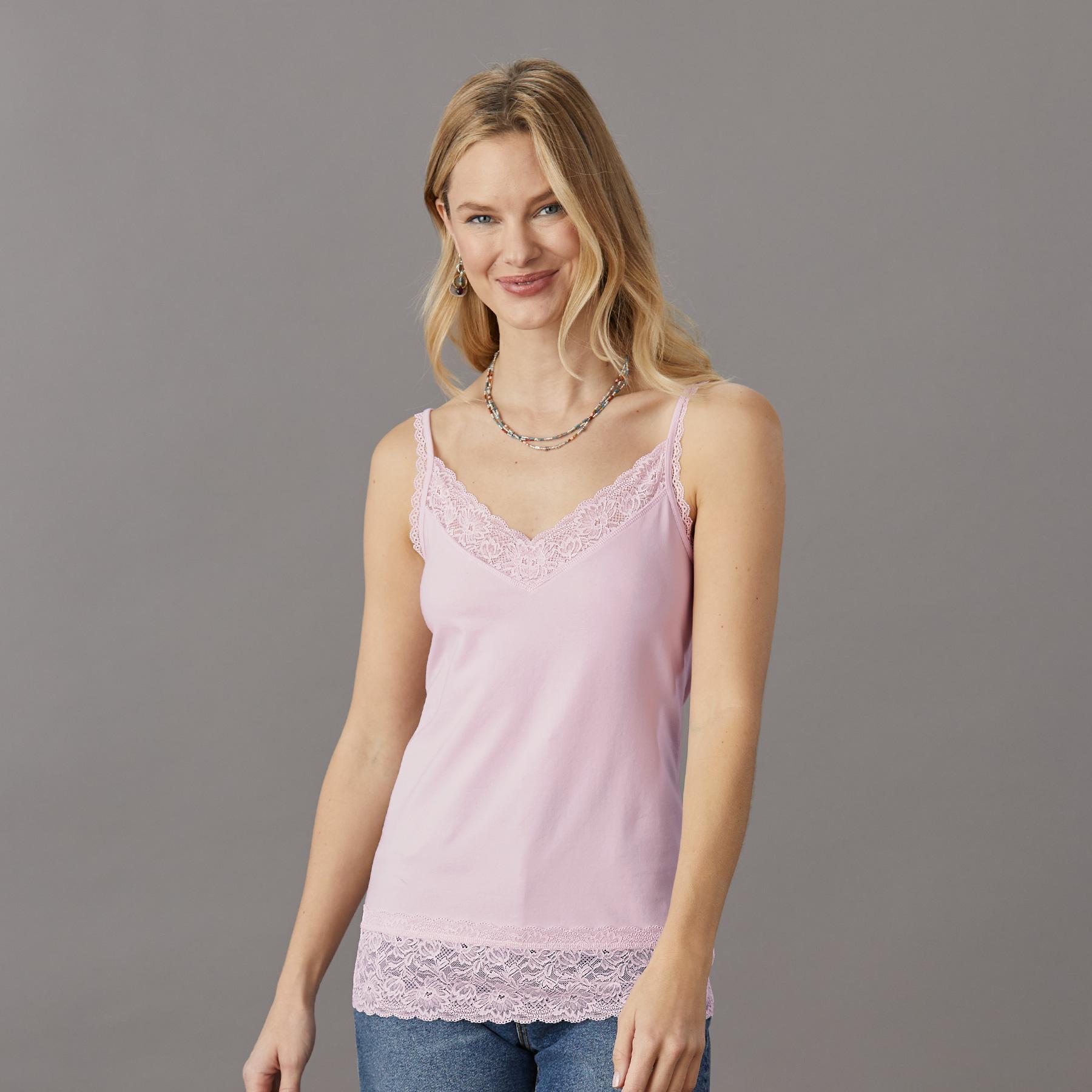 An everyday essential with the most beautiful lace at V-neck. shoulder straps and hem. Stretchy and soft. it makes the perfect underlayer. Supima cotton/spandex. Machine wash. Imported. Exclusive. Sizes XXS (00). XS (0–2). S (4–6). M (8–10). L (12–14). XL (16–18). Approx. 24l.