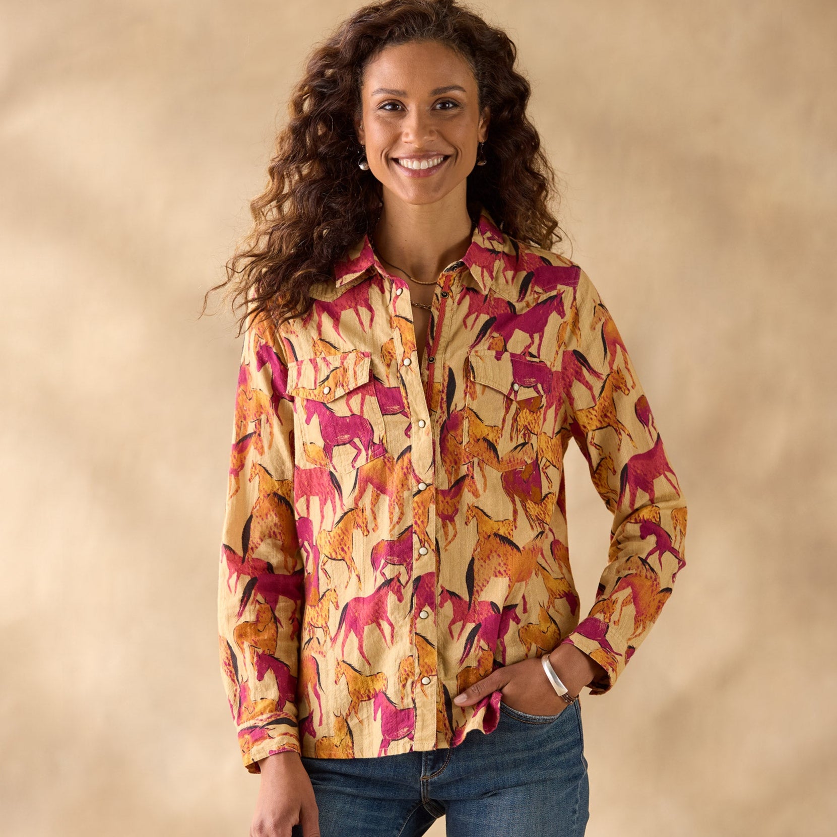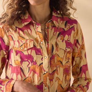 Western-inspired. pearlized snap front shirt in the prettiest cotton dobby with equestrian print. Two chest pockets. lace detail at back neck. grosgrain ribbon at placket. Western back yoke and shirttail hem. Machine wash. Imported. Exclusive. Sizes XXS (00). XS (0?C2). S (4?C6). M (8?C10). L (12?C14). XL (16?C18). Approx. 25l.