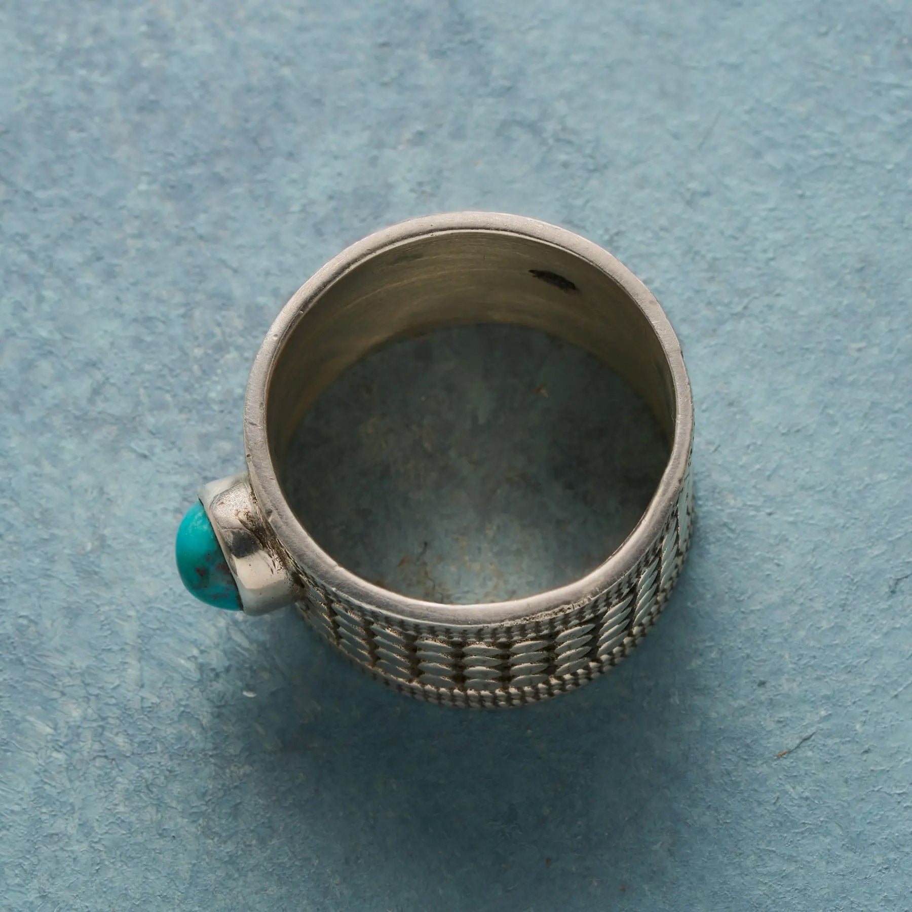 A cabochon of bright blue turquoise centers this wide. dotted band like a fountain in a cobblestoned square. Sterling silver. Handcrafted. Exclusive. Whole sizes 5-10. 1/2w.