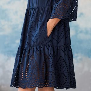 Captivating eyelet details and an appliqu??. notched neckline take this charming. tiered dress to transcendent heights. Cotton. Hand wash. Imported. Sizes XS (0 to 2). S (4 to 6). M (8 to 10). L (12 to 14). XL (16 to 18). XXL (20 to 22). Approx. 38-1/4L.