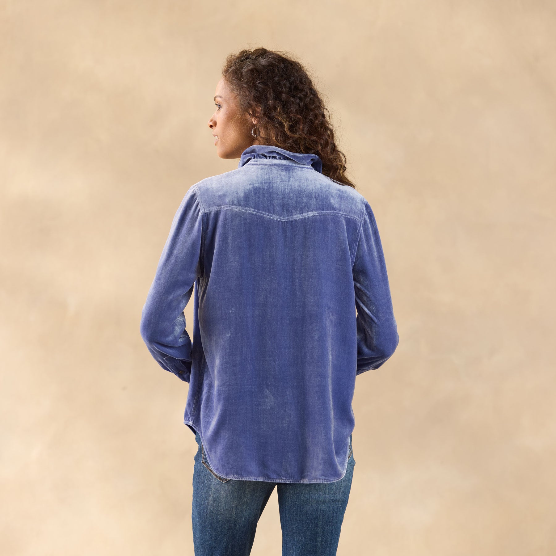 This Western inspired. soft velvet shirt is beautiful with ruffles at the neckline for a feminine twist. Two patch pockets. snap closure and bandana print detail inside. Viscose/silk. Dry clean. Imported. Exclusive. Sizes XS (0–2). S (4–6). M (8–10). L (12–14). XL (16–18). XXL (20–22). Approx. 26l.