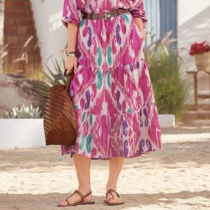 Effortless and graceful. this midi-length tiered skirt sports a jacquard print and an elastic waist. Cotton. Machine wash. Imported. Sizes XS/S. S/M. M/L. Approx. 40l.