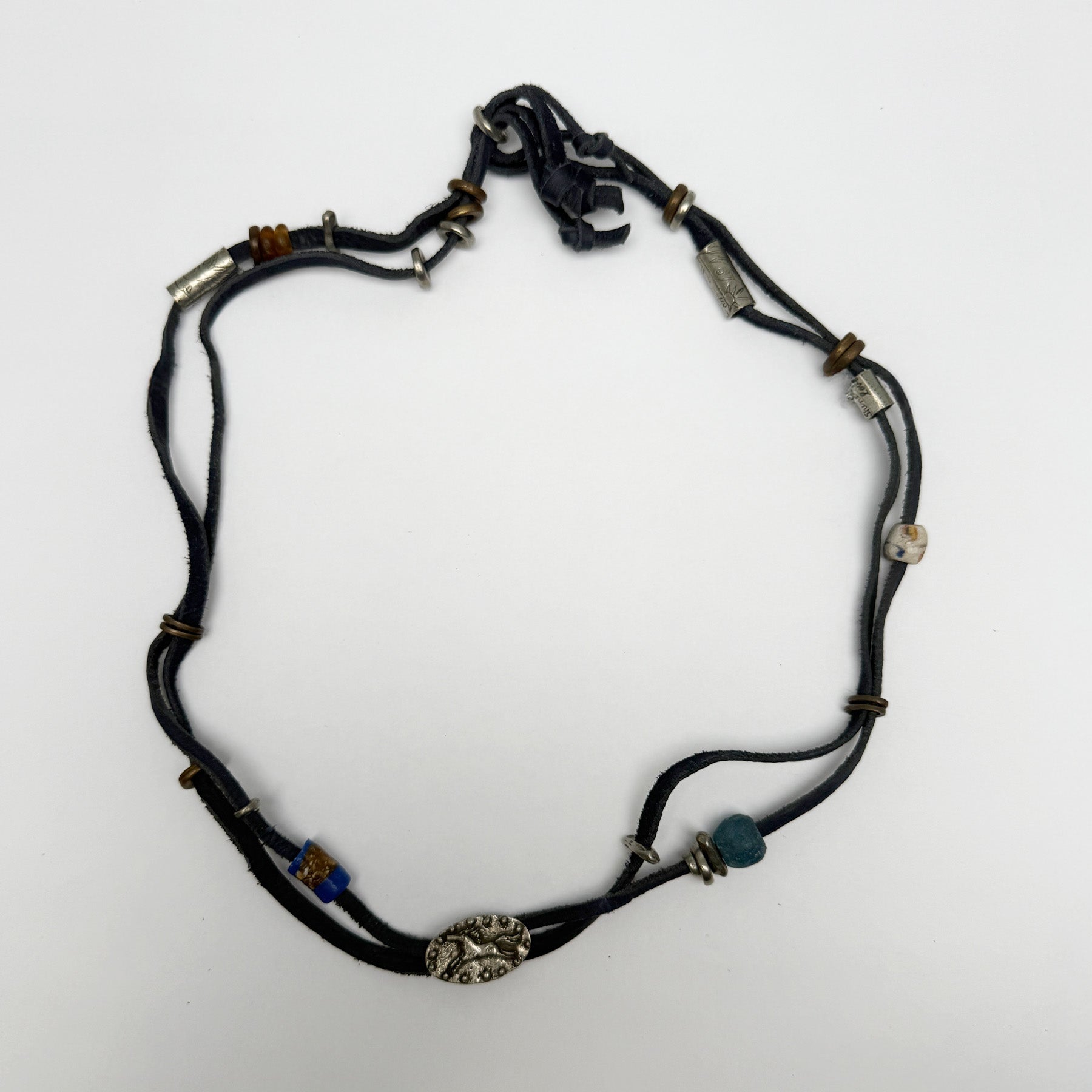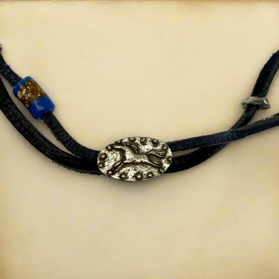 Crafted from black leather. this rustic hat band features a mix of metal and stone beads. highlighted by a silver-tone oval centerpiece with a running horse design. A unique accessory to add character and Western flair to your favorite hat.