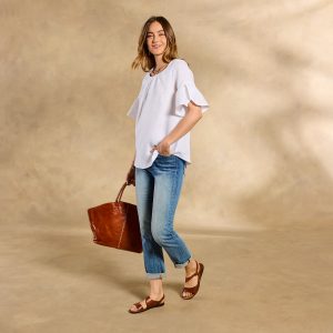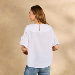 You’ll feel free in our flowing and relaxed top with elegant flutter sleeves and shirring at the neckline. Keyhole at the back with button closure. Linen. Hand wash. Imported. Exclusive. Sizes XXS (00). XS (0?C2). S (4?C6). M (8?C10). L (12?C14). XL (16?C18). Approx. 23l.