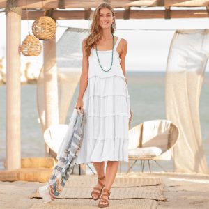 Sulty style turns heads in this off-the-charts charming. tiered dress with adjustable straps. mini ruffle neckline and seams and elastic. gathered back for a flattering fit. Lined. Linen. Machine wash. Imported. Exclusive. Sizes XS (0 to 2). S (4 to 6). M (8 to 10). L (12 to 14). XL (16 to 18). Approx. 39L.
