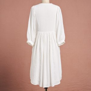 Our window pane textured dress is full of lovely detail with tonal embroidery at the front placket. two shell buttons at the sleeve cuffs. notched V-neck and feminine puff sleeves. Fully lined. two pockets. Cotton. Machine wash. Imported. Exclusive. Sizes XS (0-2). S (4-6). M (8-10). L (12-14). XL (16-18). XXL (20-22). Approx. 38.5l.