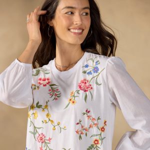 Lush floral embroidery will brighten your day on this crewneck top with long. elastic cuff sleeves. Cotton. Machine wash. Imported. Sundance exclusive. Sizes XS (4). S (6). M (8–10). L (12). XL (14). XXL (16). Approx. 25.75l.