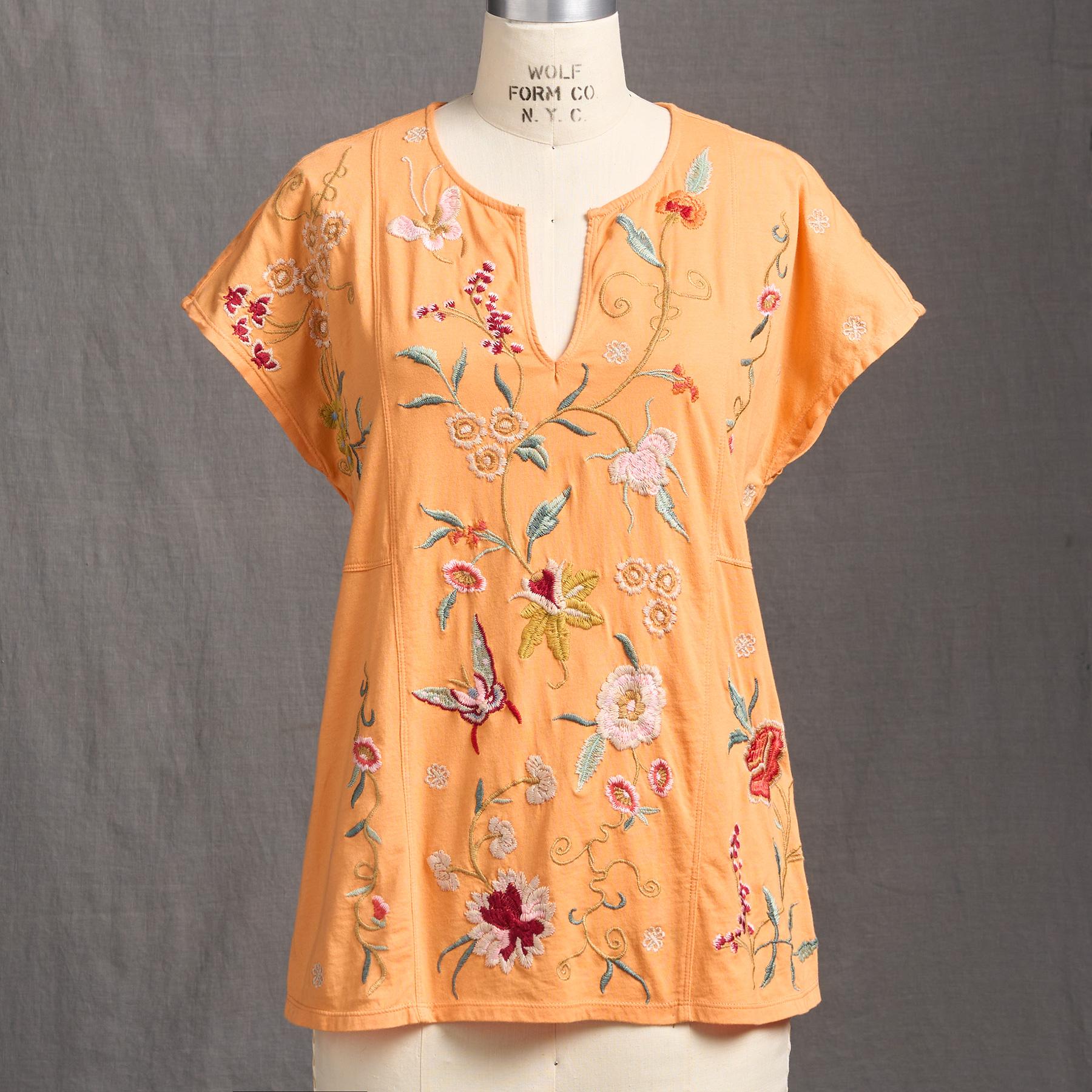 Beautiful floral and geometric embroidery flutters across the front and back of this easy-fit. notch neck top with cap sleeves and side slits. Cotton. Machine wash. Imported. Sizes XS (4). S (6). M (8-10). L (12). XL (14). XXL (16). Approx. 26l.