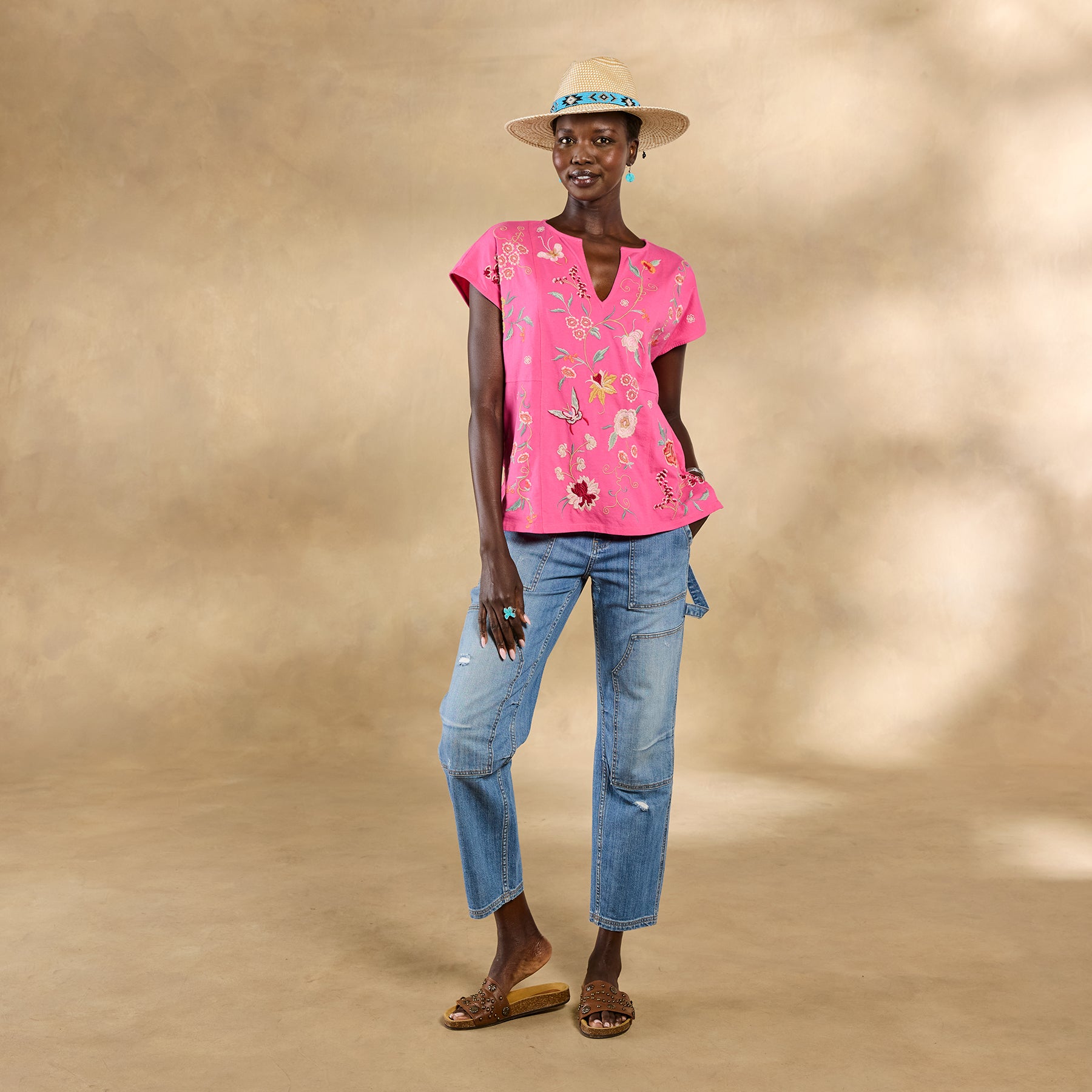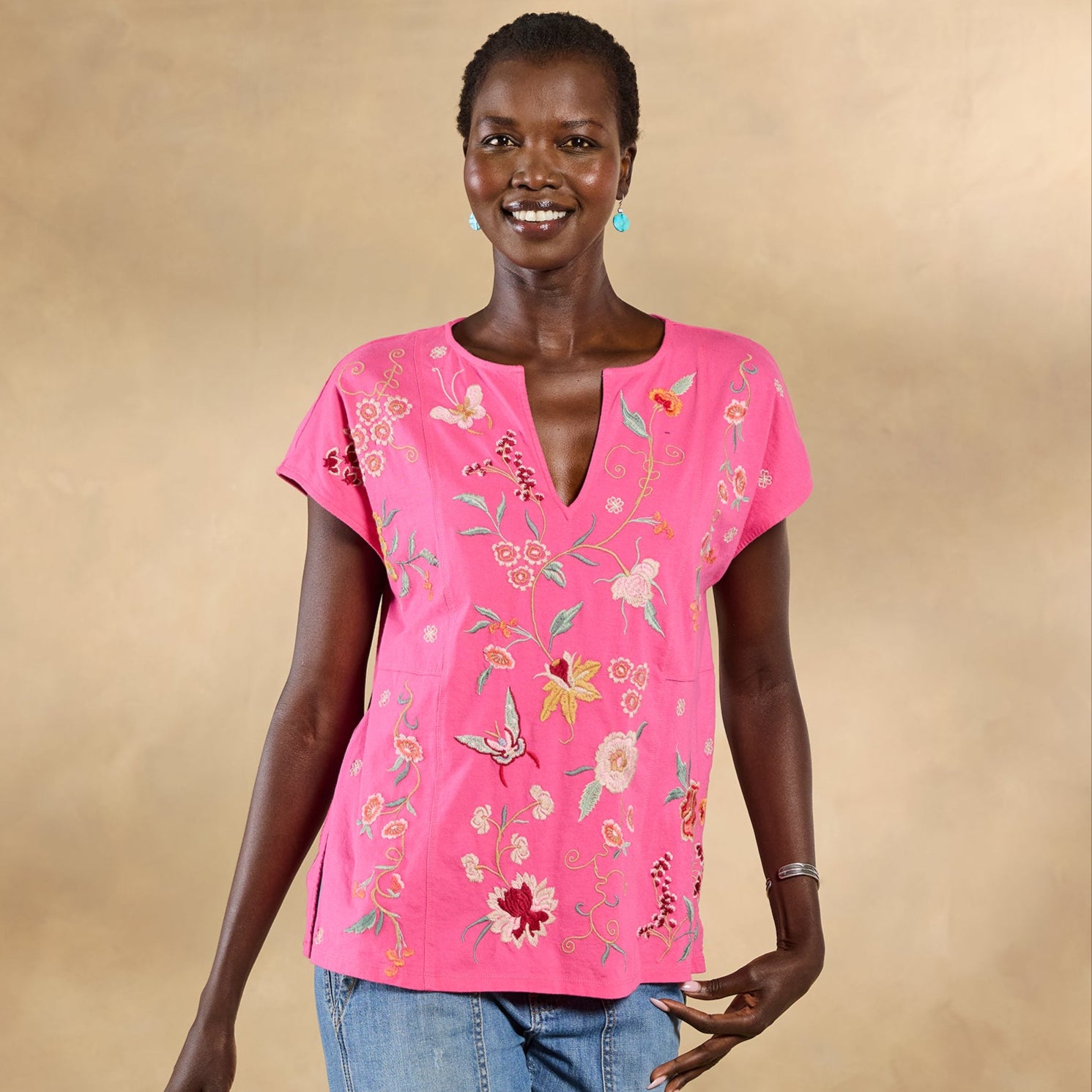 Beautiful floral and geometric embroidery flutters across the front and back of this easy-fit. notch neck top with cap sleeves and side slits. Cotton. Machine wash. Imported. Sizes XXS (2). XS (4). S (6). M (8-10). L (12). XL (14). Approx. 24.25l.