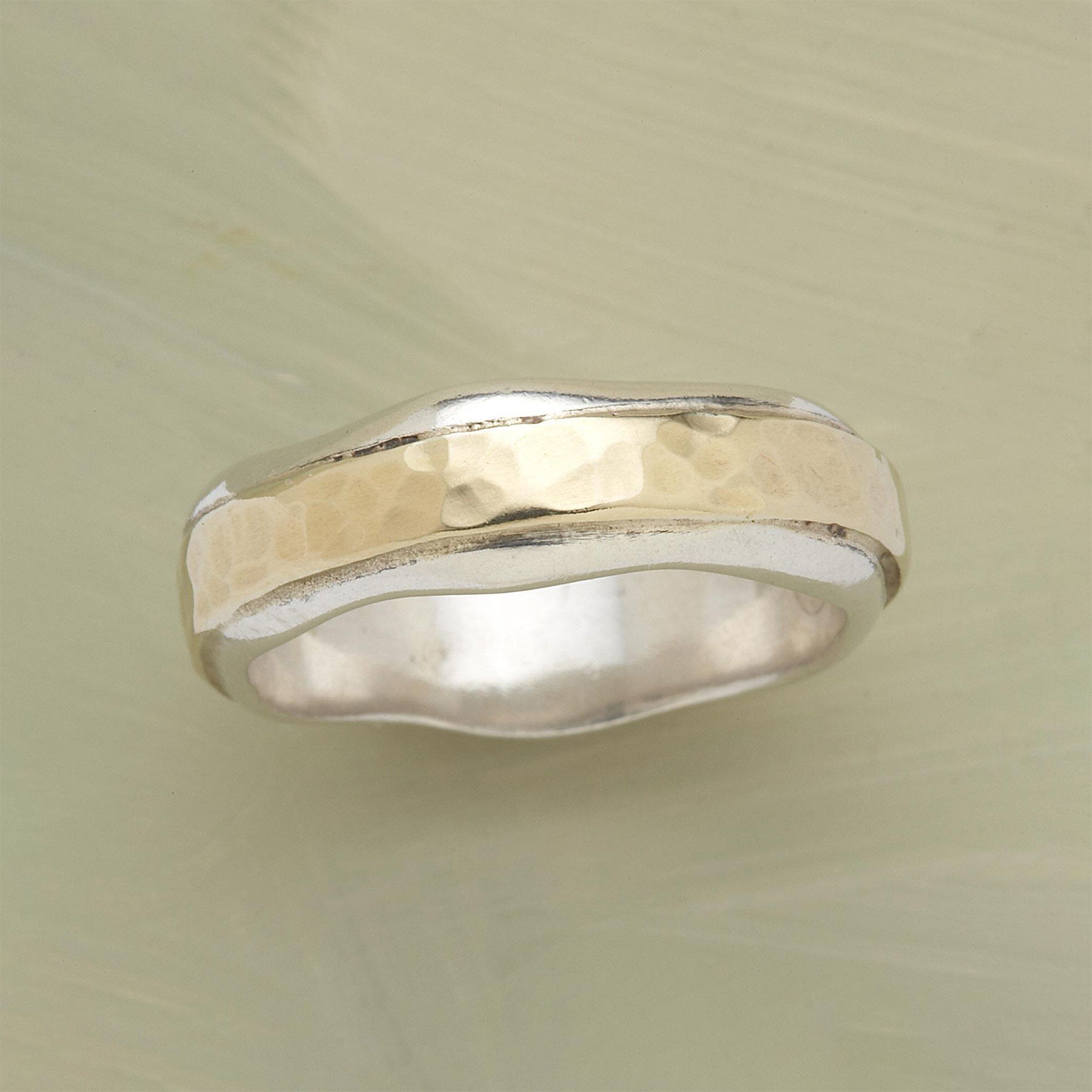 Wavy sterling silver borders symbolize life’s ups and downs. Hammered 14kt gold center. Whole and half sizes 5-10.5. Approx. 1/4w.